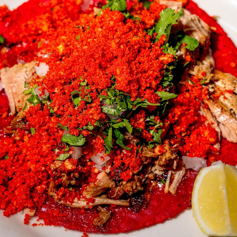 Carnitas taco with hot cheetos tortilla and cheese, topped with hot cheetos, onion, and cilantro.