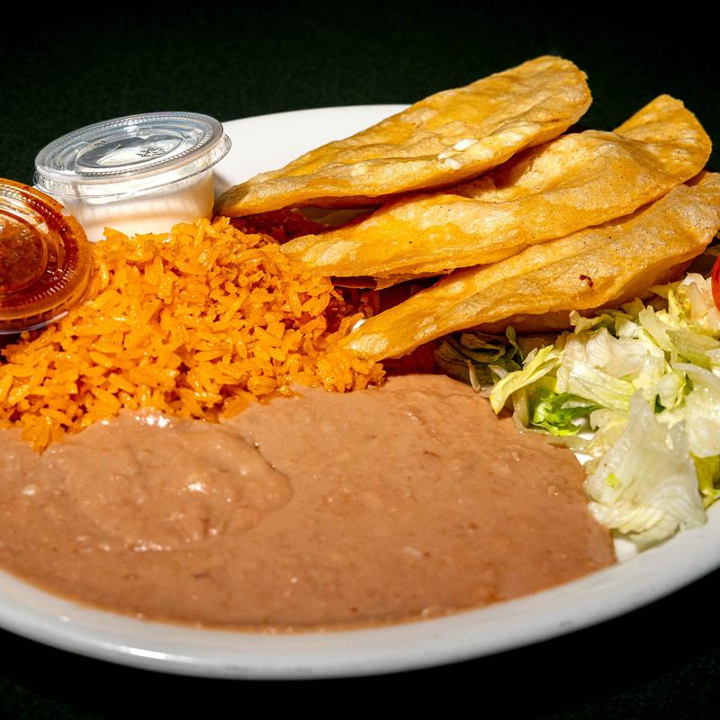 Three empanadas served with refried beans, Mexican rice, shredded lettuce, tomato slices, and a side of sour cream.